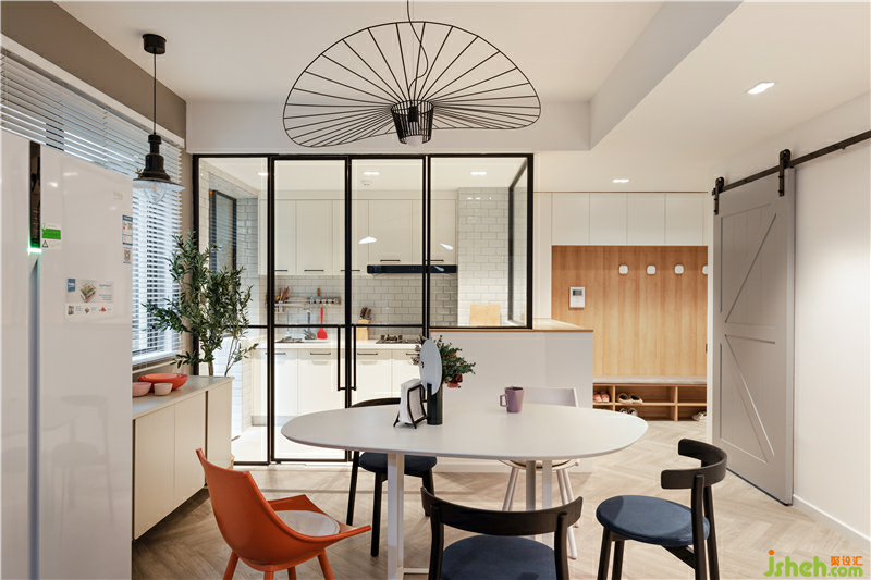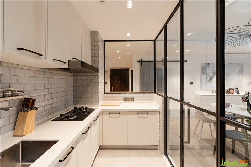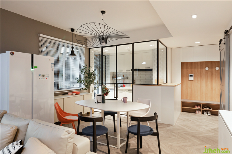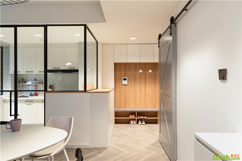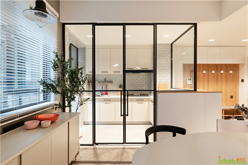 解決方式 2. 從空間上把廚房的實(shí)體墻改為鐵藝玻璃墻體,從而解決了進(jìn)門(mén)玄關(guān)較壓抑的問(wèn)題。