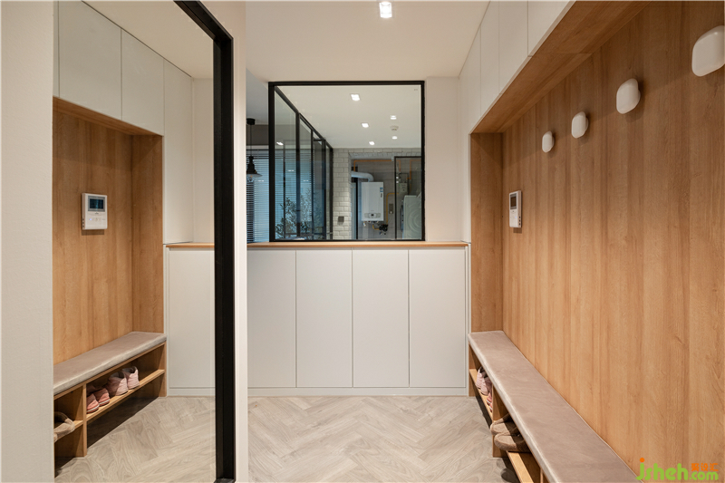 玄關(guān)做了整體儲(chǔ)物柜,包含換鞋凳,常用鞋區(qū),臨時(shí)放鞋區(qū),雜物收納區(qū)(雨傘等),和過(guò)季儲(chǔ)鞋區(qū)。更衣鏡遮擋電箱。