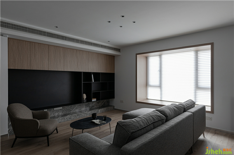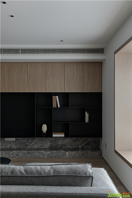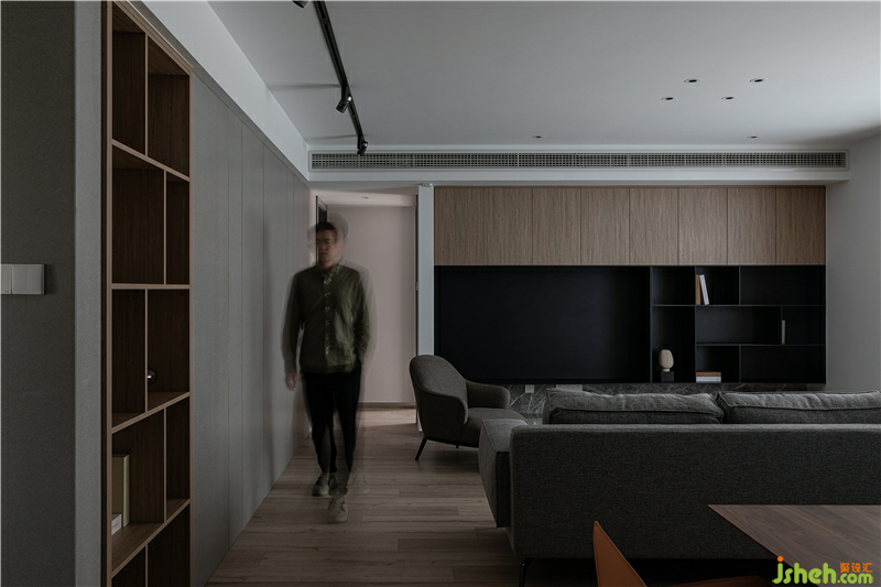 屋主喜歡比較暗黑、穩(wěn)重的調(diào)性,無(wú)論是背景墻還是客廳+老人房的公用墻,都做了置物架,方便未來(lái)屋主展示他們的收藏和書籍。裝修設(shè)計(jì)