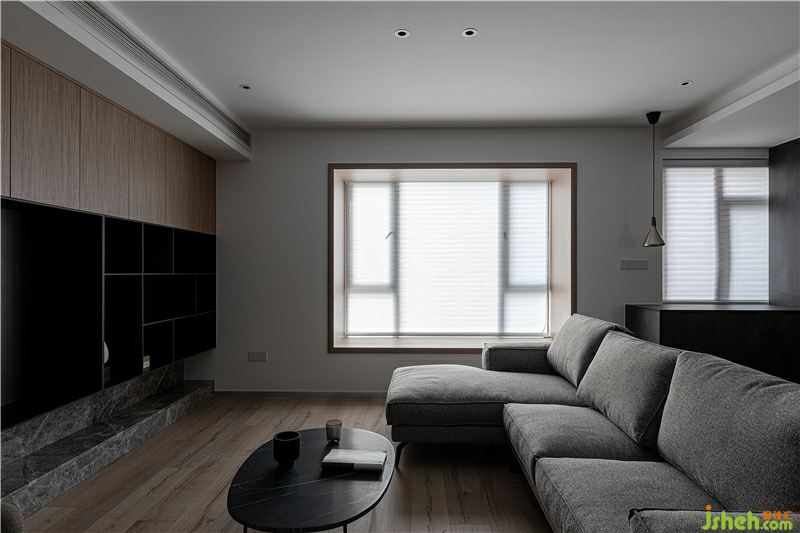 客廳采用的無(wú)主燈設(shè)計(jì),是讓整屋保持簡(jiǎn)潔的要點(diǎn)之一。飄窗臺(tái)預(yù)留的燈位與客廳區(qū)域的燈光達(dá)到一個(gè)照明平衡,飄窗做木飾面裝飾墻體打破傳統(tǒng)大理石造型的生硬感。裝修設(shè)計(jì)