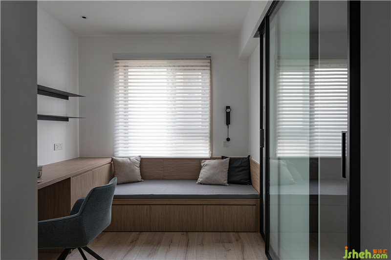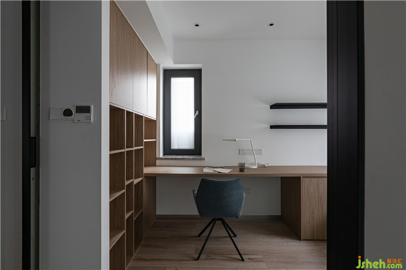 書房則設(shè)計(jì)了兩側(cè)極窄黑邊框推拉門,變成即可以獨(dú)立也可以開放的辦公間閱讀室。在制作這套推拉門時(shí)設(shè)計(jì)師與施工執(zhí)行師特別研究了許多相關(guān)資料,在施工時(shí),推拉軌道需要提前安裝預(yù)埋件,安裝完成的效果門可以“隱藏”進(jìn)墻體內(nèi)。