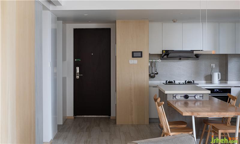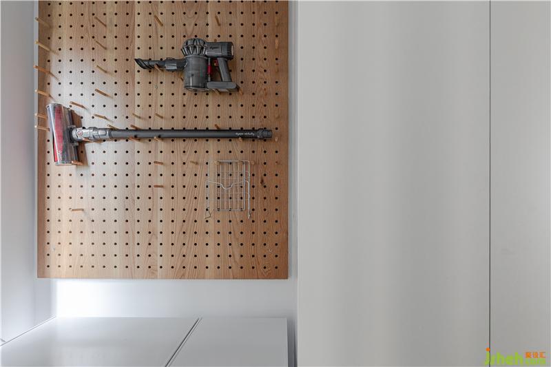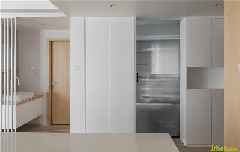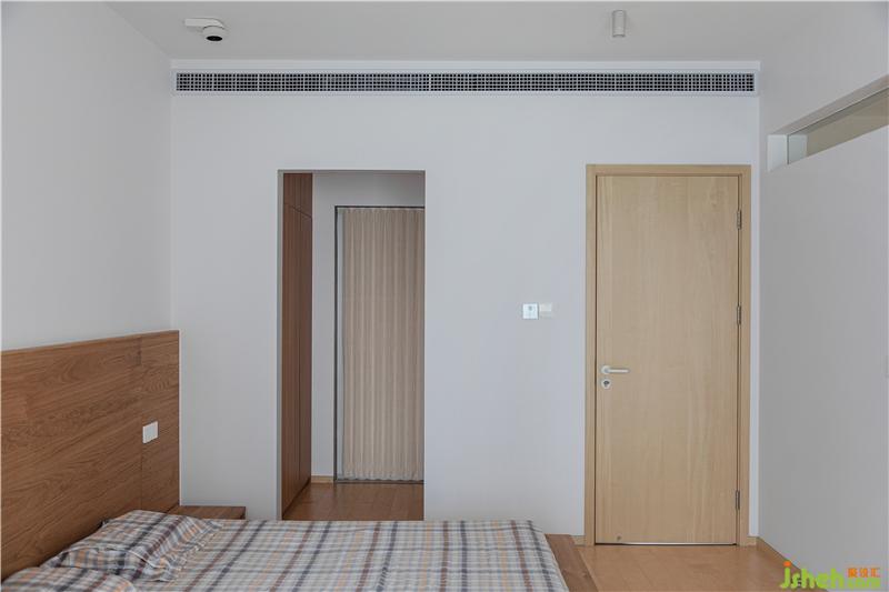 我們將中央空調的出風口放在了墻體的立面,左側的門洞內是步入式衣帽間,與衛(wèi)生間相互連接的門洞,我們采用了日本的折疊門,性價比高,不占用空間且防水耐用。