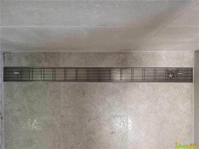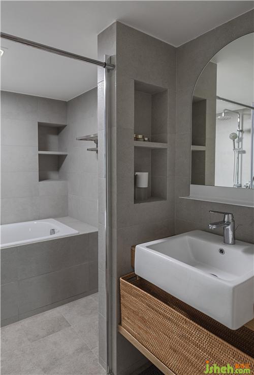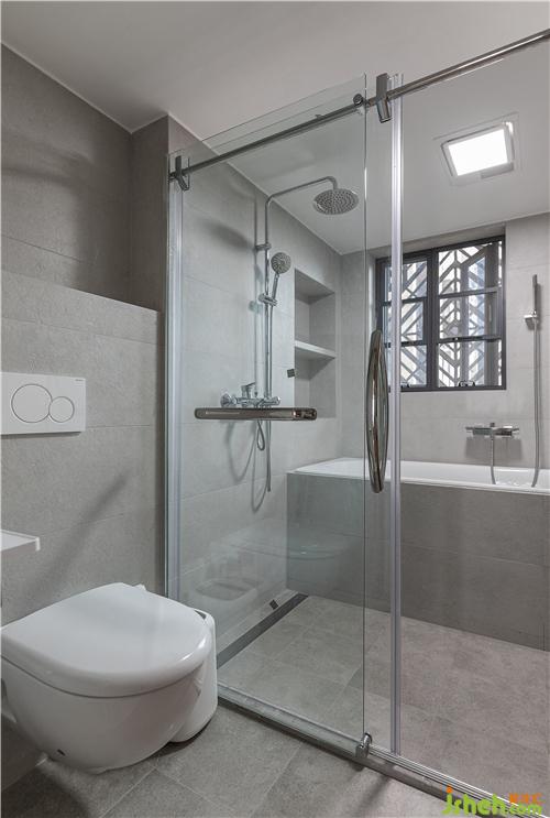 次衛(wèi)空間較小,所以沒有做淋浴房,用一塊透明玻璃作為隔斷,我們在淋浴空間與馬桶之間設計了斷水槽工藝,保證水不會流出來。