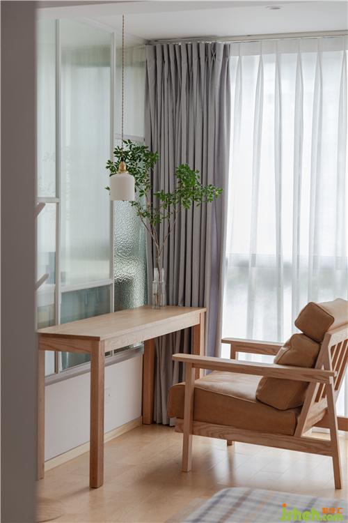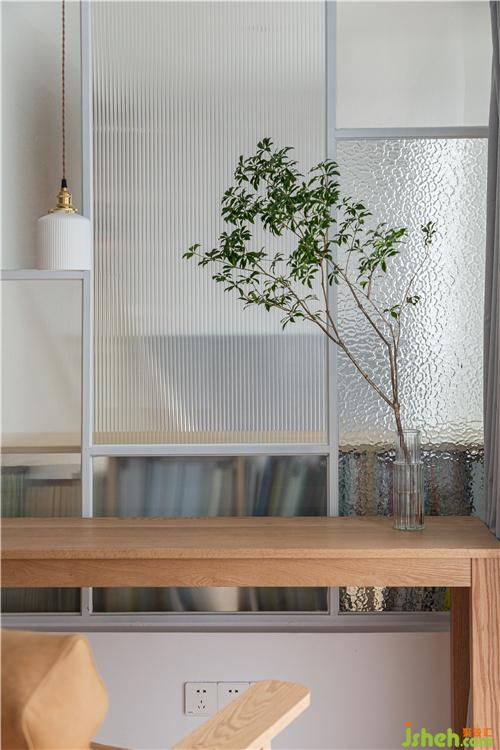中間通過4種不同的藝術玻璃進行了隔斷,透光不透明。當父親在主臥的書房閱讀時,也能大致觀察到小朋友在客廳陽臺的活動。