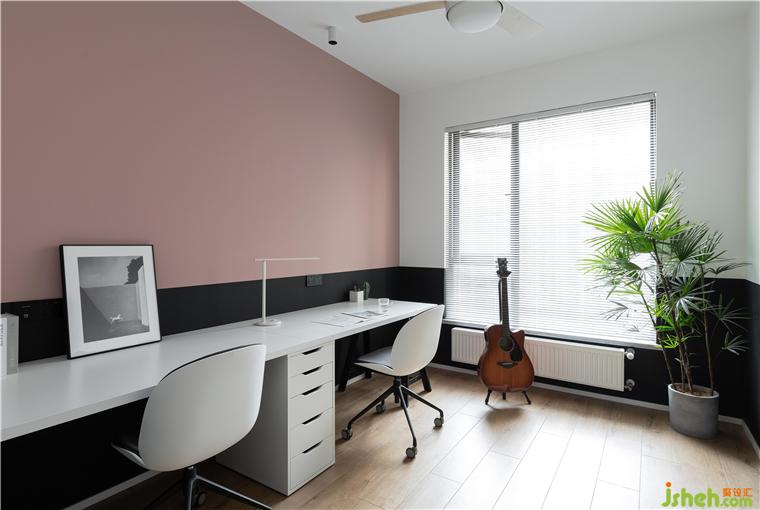 書房的乳膠漆顏色采用了黑色半墻,靠近書桌的那面墻運(yùn)用了業(yè)主喜歡的臟粉色處理,增加了整個空間的層次感。