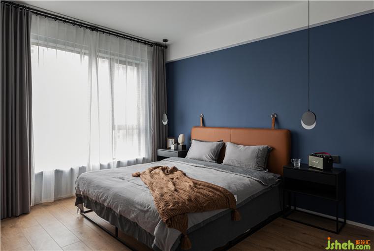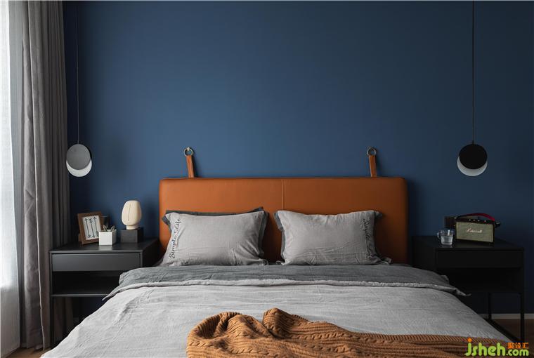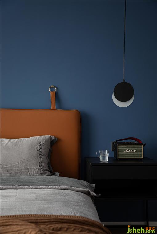 主臥的背景墻面刷了深藍(lán)色乳膠漆,烘托整個空間寧靜,深邃,讓人完全可以放松下來。