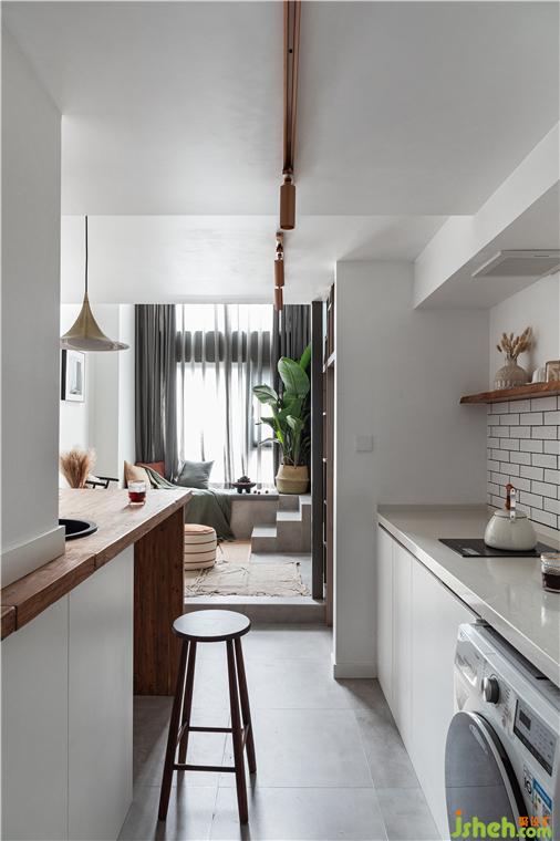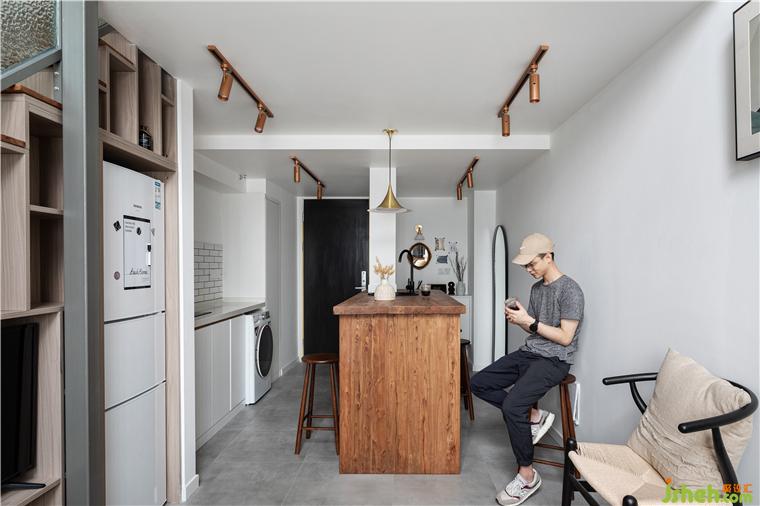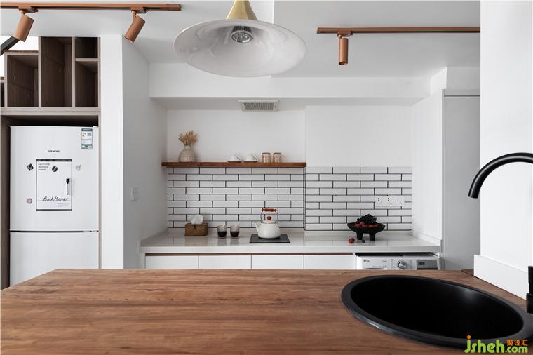 吧臺與餐桌相互結(jié)合,小水槽就近設(shè)計(jì)在吧臺上邊緣,無論是吃一份簡餐還是水果,有了它的存在就不用手忙腳亂的準(zhǔn)備食材和清洗餐杯、水果了。吧臺與對面櫥柜一起組成開放式餐廚空間,滿足使用者輕度餐飲,左邊的冰箱門上,寫著小兩口對即將到來的客人的祝福與期待。