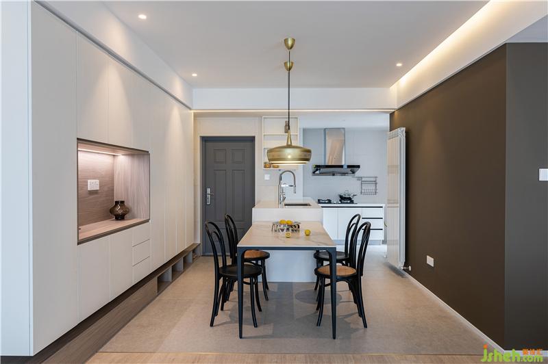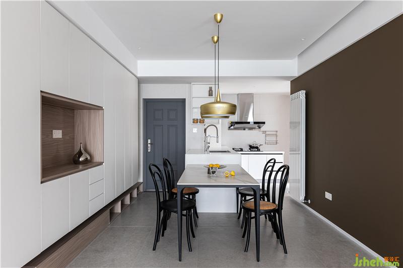 入戶后盡收眼底的客餐區(qū)是白色基底搭配特調的深淺咖色上墻,是理性的土老師與溫柔的琪姐之間的魅力碰撞?;A的收納功能林立在入戶兩側,既收納四季鞋類同時還能收納客餐廳雜物以及小朋友的玩具。