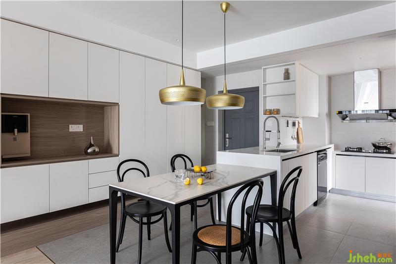廚房沒有了遮擋物,視線自然通透。開放式的餐廚區(qū),一切以小舒顏的成長和安全出發(fā),無論孩子在何處,父母的視線都能緊隨其后。