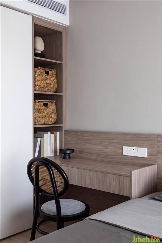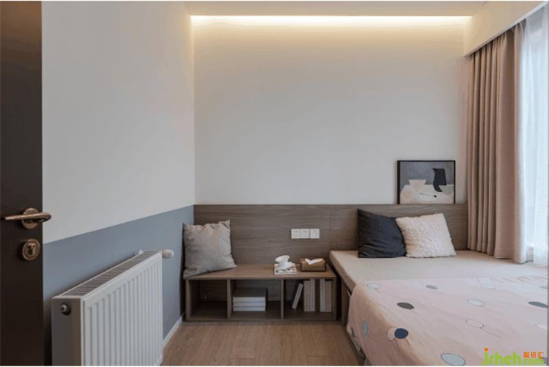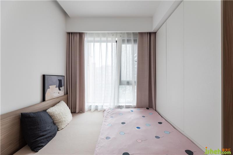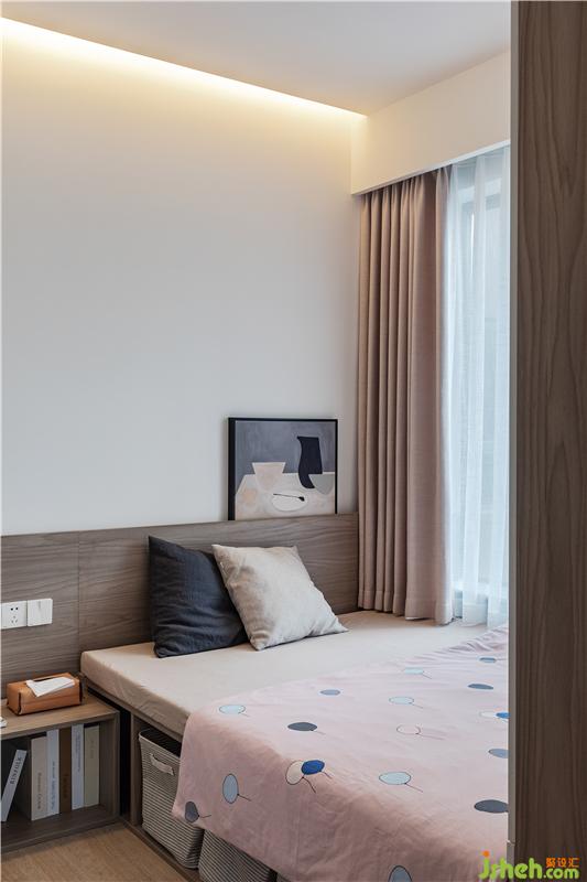 兒童房不大,為了保證有一定的收納空間,以榻榻米+定制柜的形式呈現(xiàn)。由于小舒顏年紀(jì)太小,直到2歲以后才考慮與父母分床睡。所以室內(nèi)設(shè)計(jì)師選擇一組床邊套柜,不需要時(shí)收納進(jìn)床邊也不占空間;需要時(shí),格子拉出來(lái)變成一排矮凳,L型格子滿足孩子成長(zhǎng)中逐漸增加的收納需求。