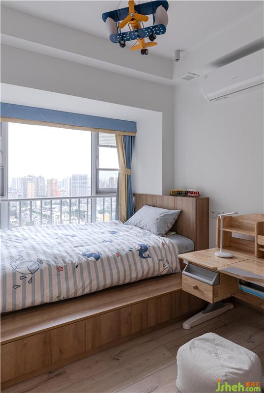 兒童房面積不大,所以室內(nèi)設計師考慮到孩子逐漸成長需要收納的東西會越來越多,于是把飄窗臺與榻榻米進行結合后,“偷”了部分空間形成了可收納床。富有童心的飛機燈,夜幕降臨后,窗外一眼就能瞧見都市的繁華與寧靜是孩子最好的繪本。
