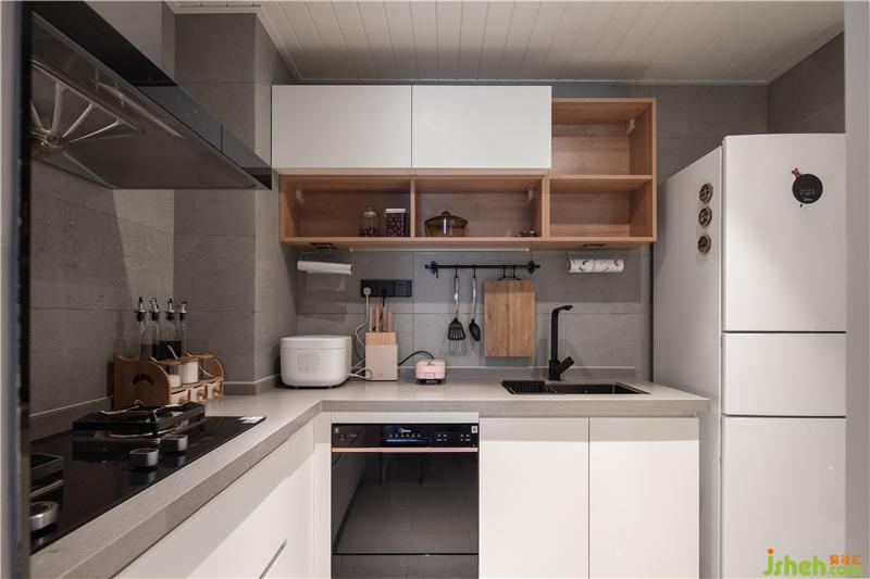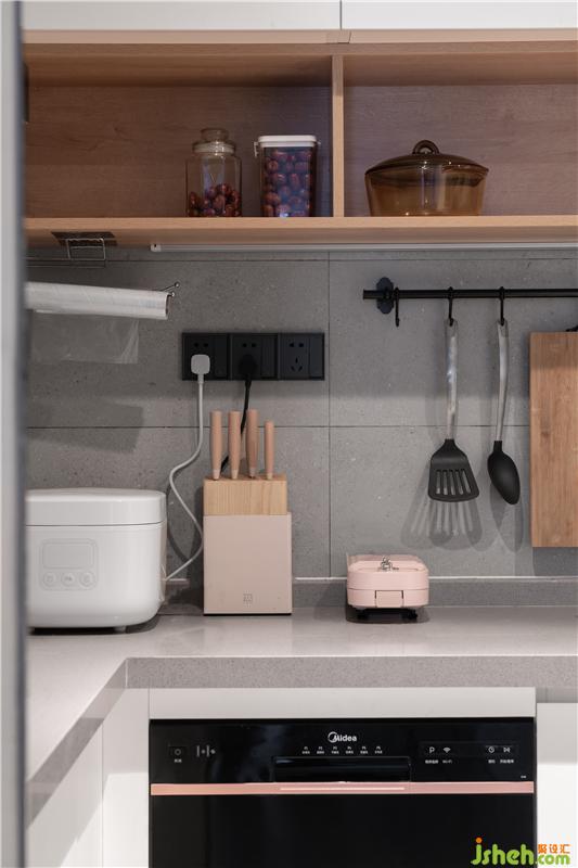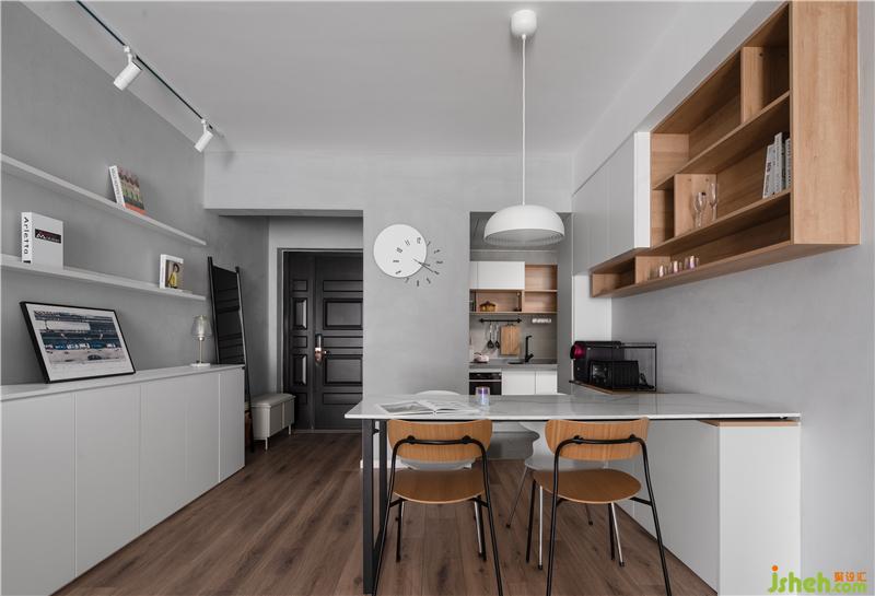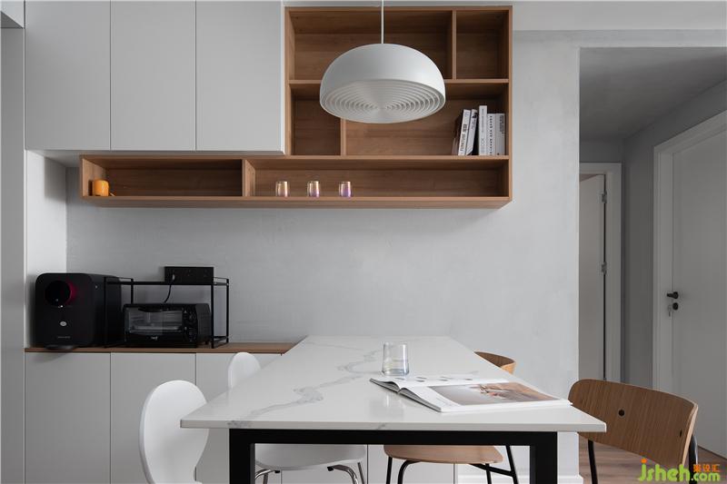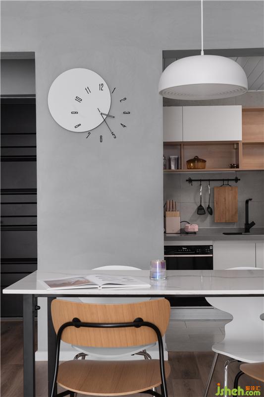 利用玄關(guān)至廚房的轉(zhuǎn)角,將餐廳與廚房進了結(jié)合,把餐桌與島臺放在櫥柜上面,一個有儀式感與煙火氣的餐廚區(qū)就這樣誕生了。