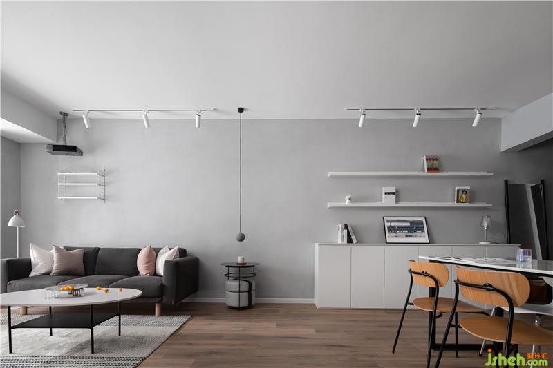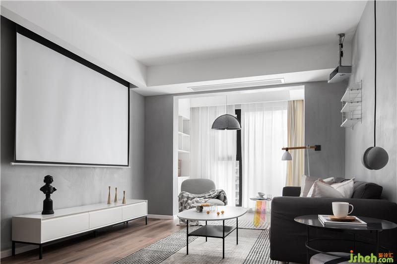 客廳把陽臺作為閱讀區(qū)一起擴入了室內(nèi),同時也作為客廳的補充座椅,投影儀更適合作為聚會與獨享下班時光的娛樂。