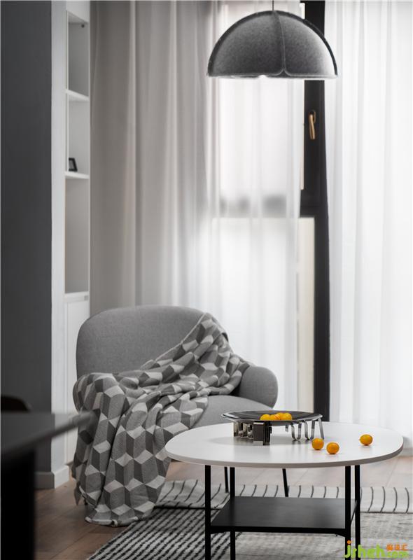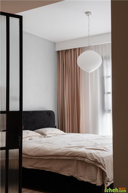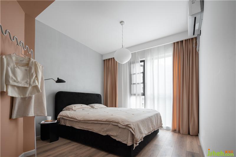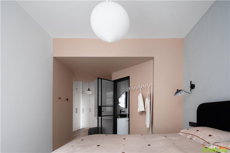 主臥把書房納入打造三面環(huán)繞的大衣帽間,滿足屋主的收納需求。利用改造的衛(wèi)生間切角做梳妝臺(tái)墻面使用有色乳膠漆與水泥漆撞色劃分空間。主臥考慮到女生的隱私空間和獨(dú)居性,在黑白灰的主冷色調(diào)上,使用暖色乳膠漆,提升入睡前的氛圍感,獨(dú)居更是需要高品質(zhì)的生活。