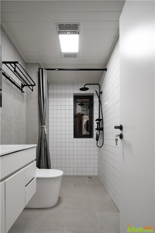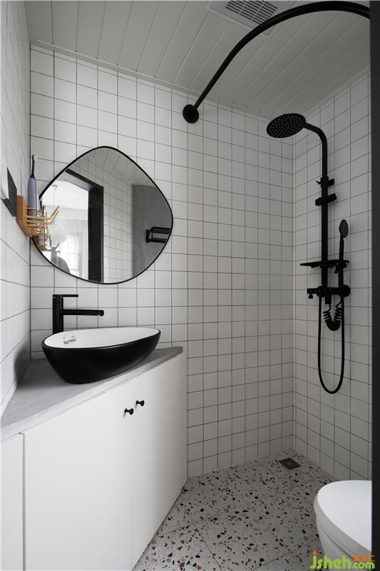 次衛(wèi)呼應(yīng)整體風(fēng)格使用水泥磚與屋主喜愛的北歐小磚搭配,利用包水管的墻面厚度延伸做了儲(chǔ)物壁龕。