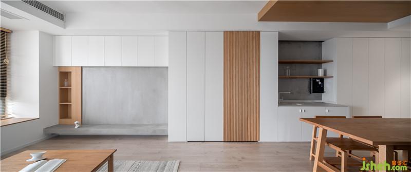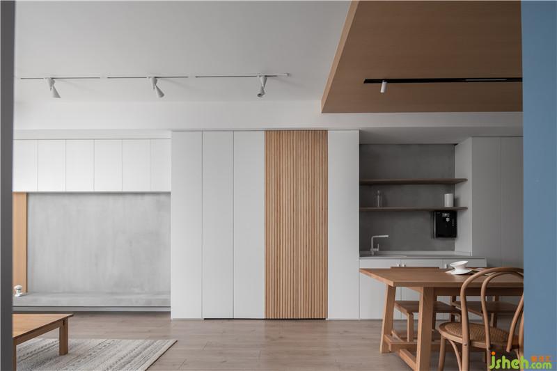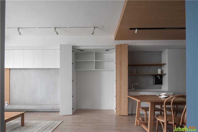 小朋友的課余活動(dòng)是鋼琴練習(xí),所以從動(dòng)圖里可以看到一組由白色板材和橡木色柵欄組合的折疊門(mén)內(nèi)就是放置鋼琴的區(qū)域,把鋼琴也考慮成一件大型收納物品,需要時(shí)打開(kāi)門(mén)使用,不需要時(shí)也可收納起來(lái),空間放眼望去整體就不會(huì)突兀。