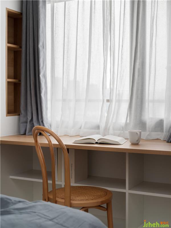 原始主臥空間局促,原方案是將全部陽(yáng)臺(tái)納入主臥,但是物業(yè)部門(mén)無(wú)法通過(guò)此方案,所以?xún)H向陽(yáng)臺(tái)借用了一部分空間形成當(dāng)下的書(shū)桌。