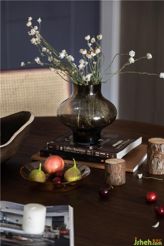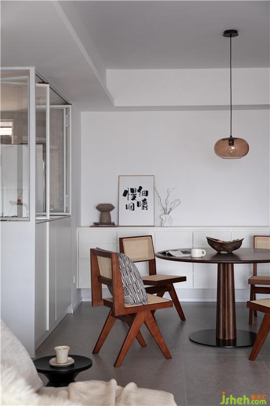 入戶后LDK格局映入眼簾,考慮到動線靈活性,我們在餐廳軟裝上選擇了二黑木作的胡桃木圓桌配合藤編椅作為生活的開場白,意為“團(tuán)圓與相聚”,搭配一組L型白色餐邊柜配合就餐人的生活習(xí)慣。而這里也成了加菲Cash或躺臥休憩,或暗中觀察屋內(nèi)人一舉一動的常駐地,身邊隨時跟它的小伙伴-泰迪Dollar.