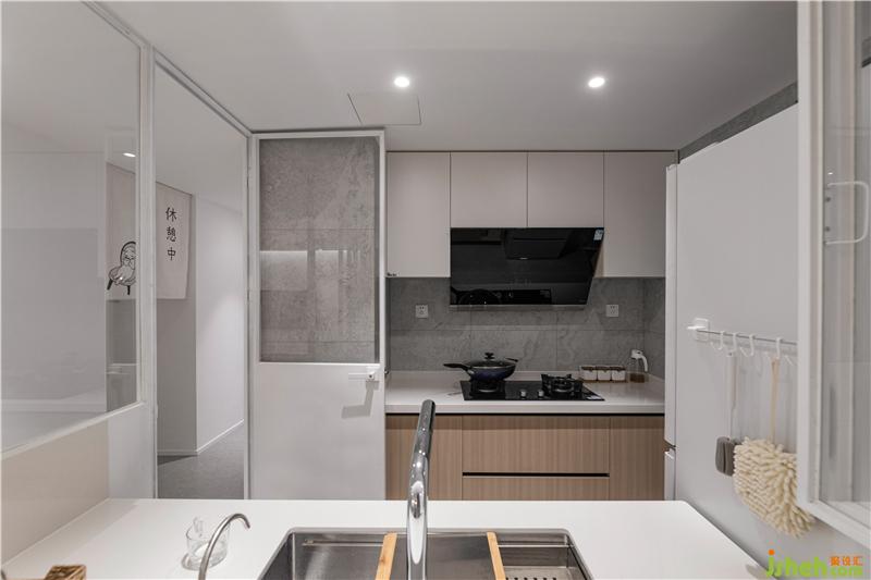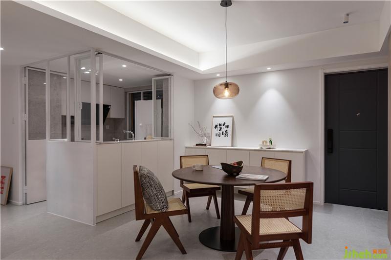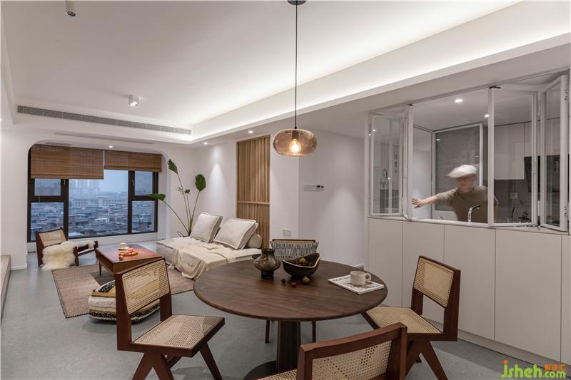 廚房門調(diào)整至過道,以鐵藝玻璃窗作為半開放式廚房的主要元素。選擇可開合的櫥窗設(shè)計,熱情好客且愛看電視的長輩,在烹飪時便能一眼捕捉到屋外的情況。