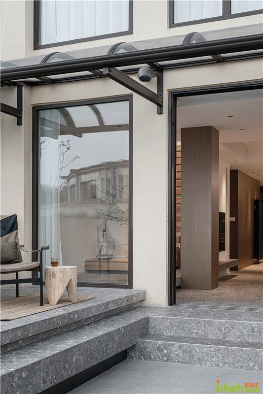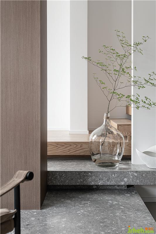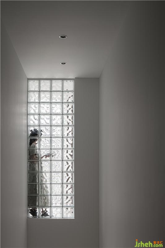 1號(hào)客房的地臺(tái)一直延伸至1樓上2樓的步梯上方,打掉1號(hào)原客房的部分墻體以玻璃磚砌墻,引南面自然光進(jìn)入樓梯間,向陽而生。