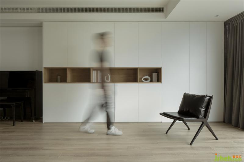 家居裝修利用左手邊整面墻設(shè)計的收納柜,對于常住人為4-5人的鞋品收納量是綽綽有余的。