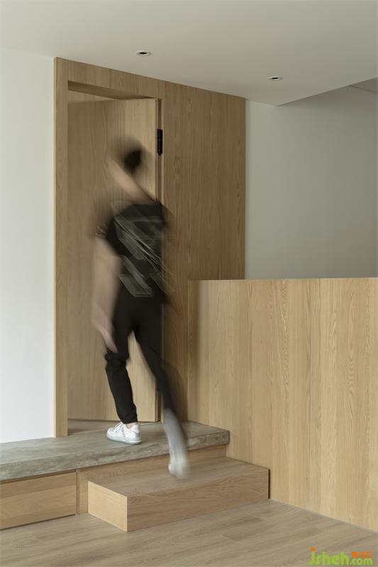 主臥門洞移位至客廳,巧妙地結(jié)合客廳與餐廳的高低差,現(xiàn)場搭建澆筑的水泥地臺(tái)面即是電視背景墻也是步入主臥的臺(tái)階。隱形門設(shè)計(jì)讓門洞避免了客廳整體的突兀感。