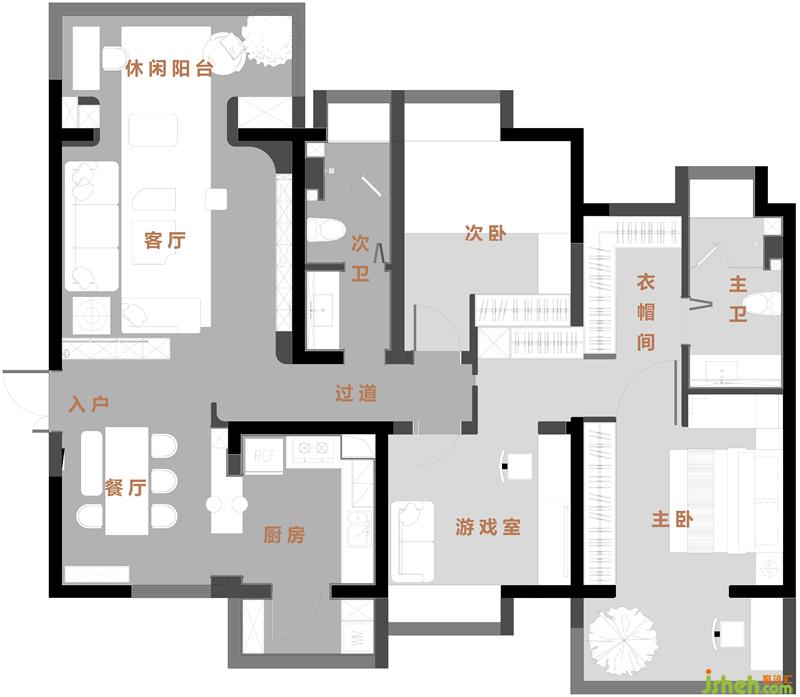 ? 主臥室布局由游戲式書房+儲物過道+衣帽間+衛(wèi)生間+臥室+休閑陽臺組成,而原始主臥無法容納下以上所有空間的問題,同時主衛(wèi)的大小也無法滿足功能的分離設(shè)計