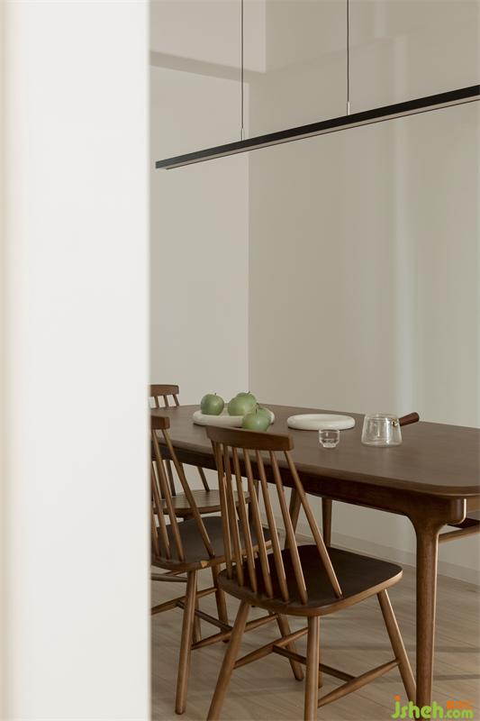 餐廳與廚房的開放式設(shè)計,由木質(zhì)吧臺進行過渡與融合,微弱柔和的吧臺燈恰好為屋主們增添了一份生活儀式上的氛圍氣。