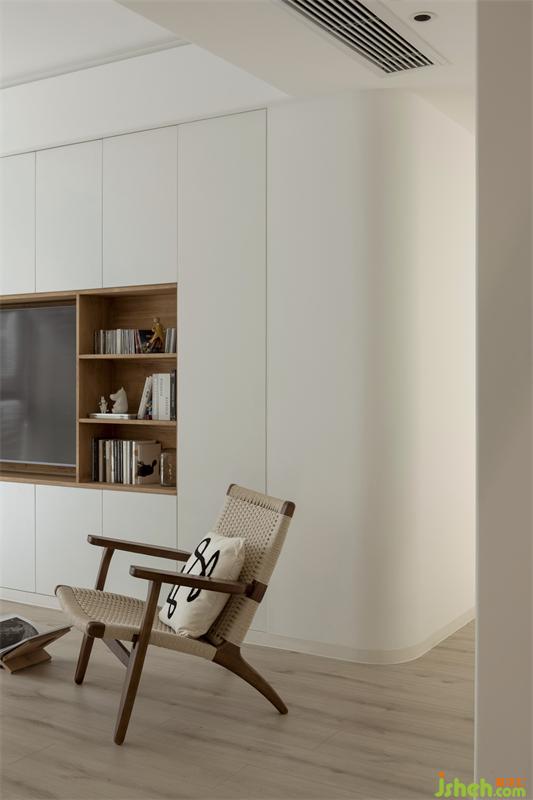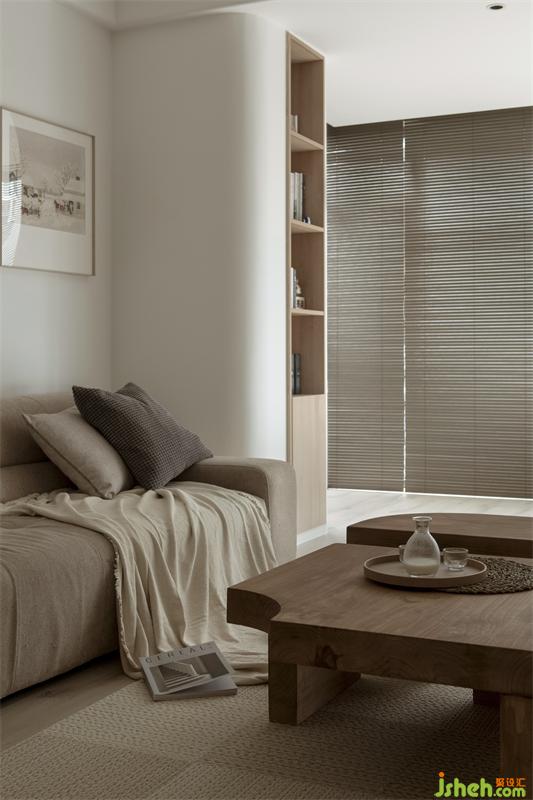 利用延長視覺+弧形的方式去改善剪力墻帶來的擁堵感,將客廳與陽臺形成一個整體。