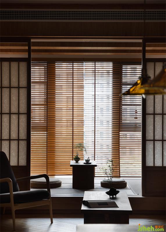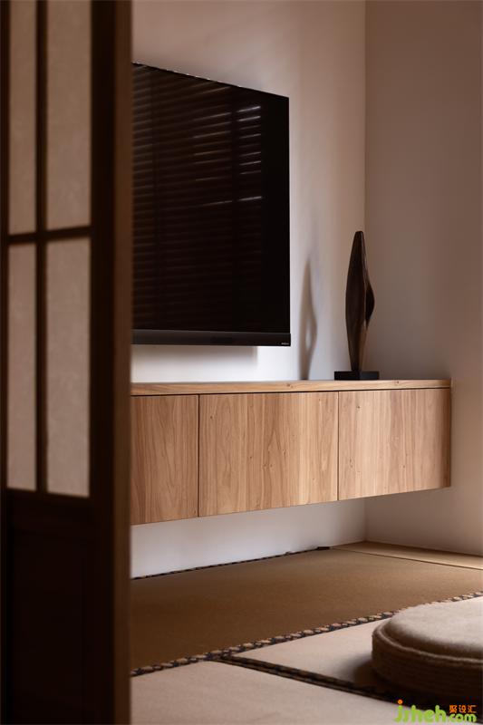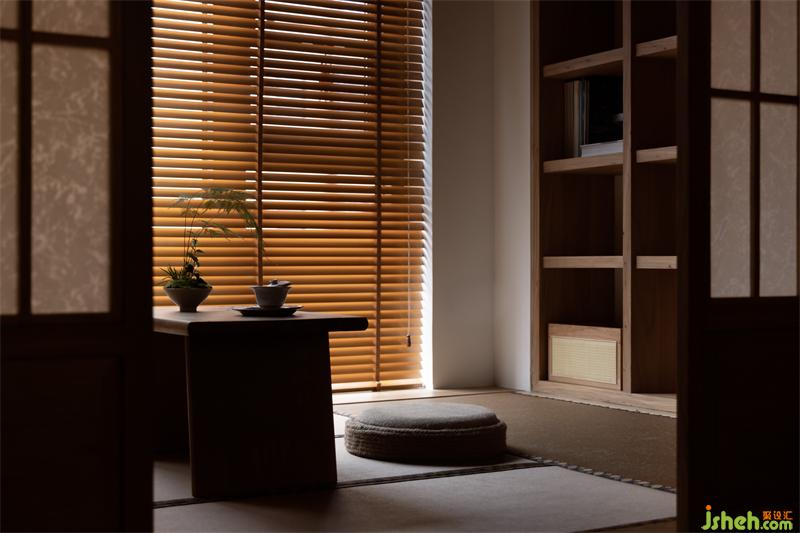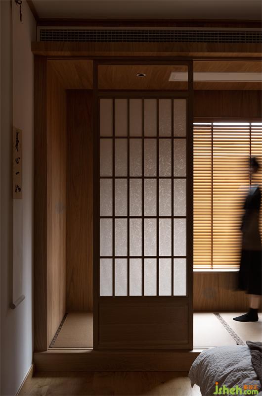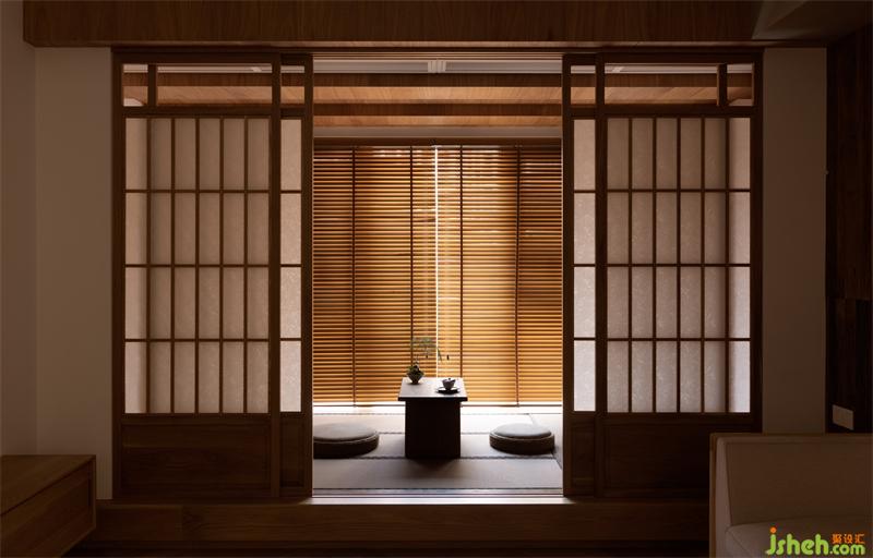 將原休閑陽臺塑造成多功能室,傳統(tǒng)古樸的推拉門運用了傳統(tǒng)日式榻榻米推拉門的做法,以樟木和障子紙形成了多功能室與客廳的隔斷。