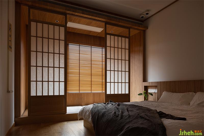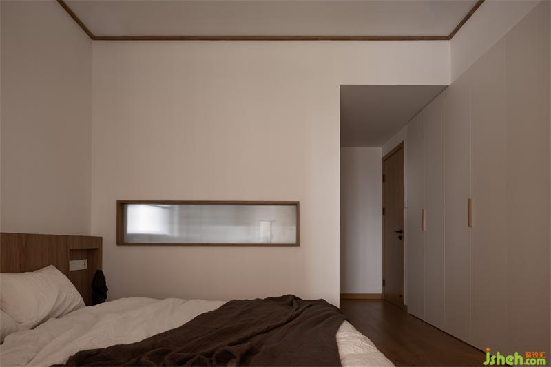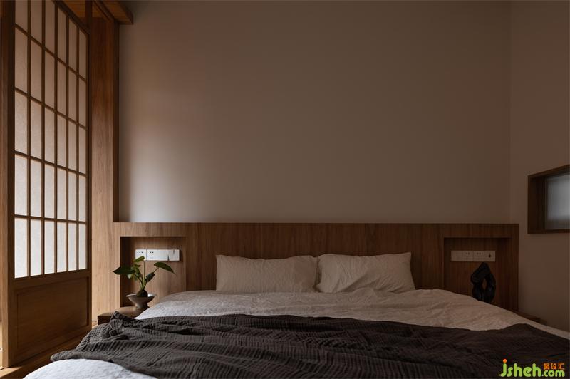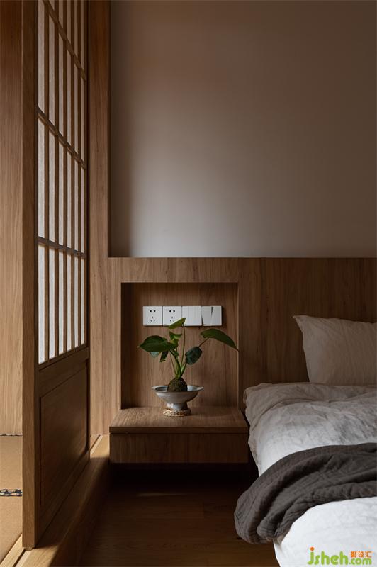 主臥的床也是實木定制,榆木的木質(zhì)感強,木紋與顏色都恰到好處,不會過深也不會過淺。床沿的高度與榻榻米陽臺齊平,不會過于突兀。