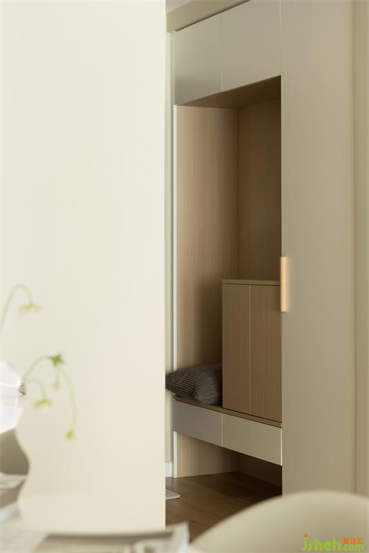 拆除入戶造型復(fù)雜的玄關(guān)柜體,替換為造型更干凈整潔的柜門,在功能性上增添帶有換鞋凳功能的收納柜。