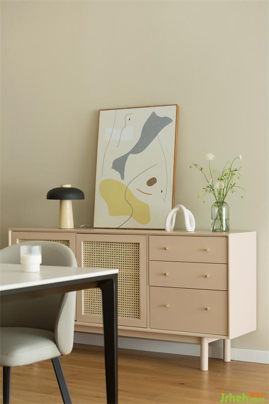 藕粉藤編餐邊柜除了補(bǔ)充餐廳的收納,同時(shí)還能擺放著二人回憶的幸福小物件,家因?yàn)楸贿@些充滿意義的小物件填滿才被叫做家。