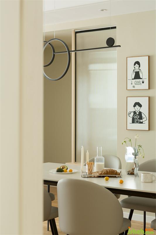 白色石材餐桌與一桌佳肴的碰撞,煙火氣便從柴米油鹽中散發(fā)出來。黑白男孩女孩頭像掛畫點(diǎn)綴了光禿的墻面還豐富了小兩口就餐氛圍,掛畫的內(nèi)容印證著兩人的幸福生活。