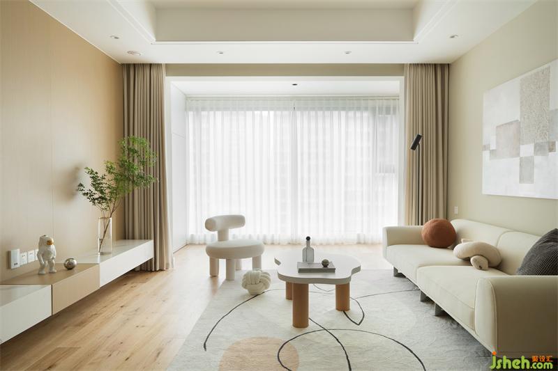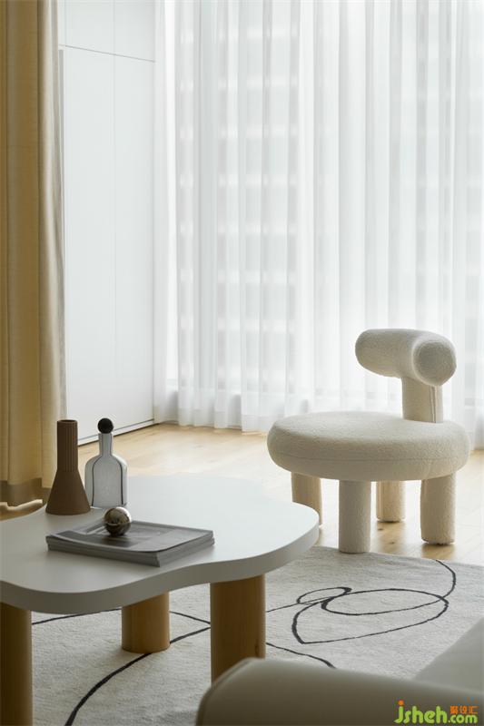 手工抽象油畫點(diǎn)綴著硬朗的墻面,柔和的筆觸與抽象線條的地毯相呼應(yīng)。米色沙發(fā)的絲絨質(zhì)感搭配白色單人椅相互呼應(yīng)。