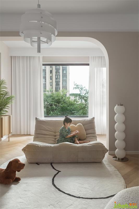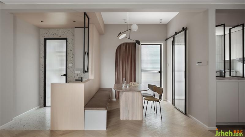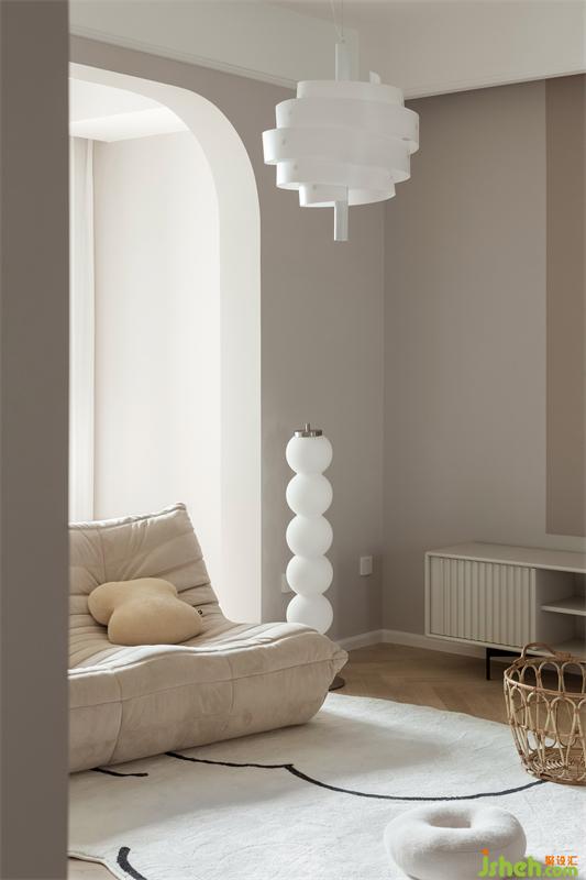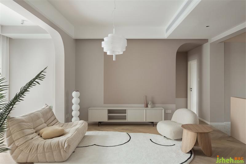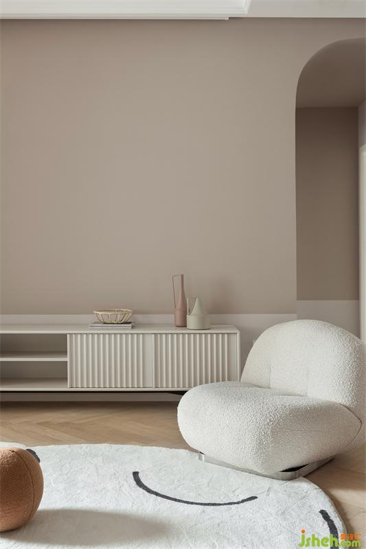 拆除客廳與陽臺間的推拉門,將弧形門洞作為兩空間的隔斷。香芋灰+粉咖作為電視背景墻,跳脫出死板生硬的墻面,給一份趣味的撞色去點(diǎn)綴整個大空間。并延伸至走廊區(qū)域,從視覺上擴(kuò)大空間。
