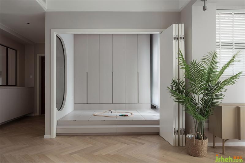 3折木門隨開隨合,兼具隱私性與通透性。關(guān)上折疊門這個區(qū)域成為獨(dú)立的休息室,打開時是小朋友玩耍、閱讀的娛樂區(qū)。