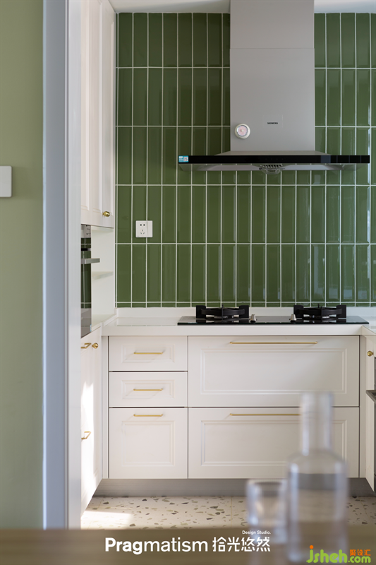廚房以白色櫥柜+荷葉綠面磚為主基調(diào),冰箱、烤箱等等做嵌入式設(shè)計,盡可能的減少因為廚房較小的空間面積,所帶來的局促感。