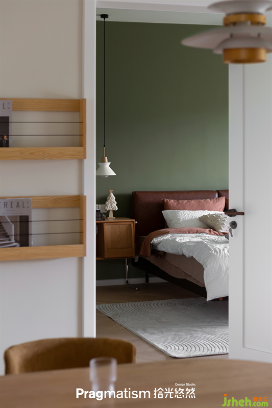 餐廳靠近主臥的墻面上設(shè)計了兩排雜志架,既方便拿取雜志滿足碎片閱讀的需求,也作為裝飾點(diǎn)綴了餐廳。