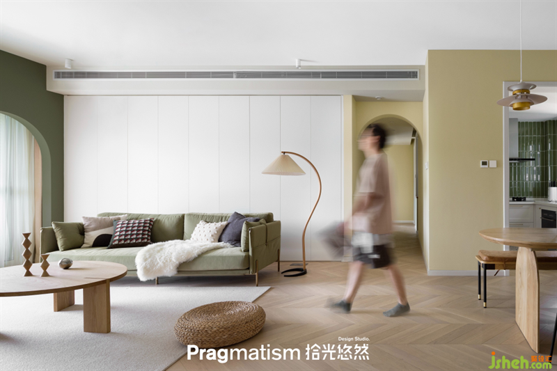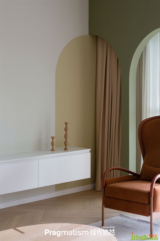 客廳在布局上并未做太大的拆改,只是通過軟裝及色彩搭配,還有墻體的弧形元素來重新打造這個空間。墨綠色的雙門洞作為一抹亮色融入其中,通過連接門洞的拱形分色墻做一個自然的延伸。