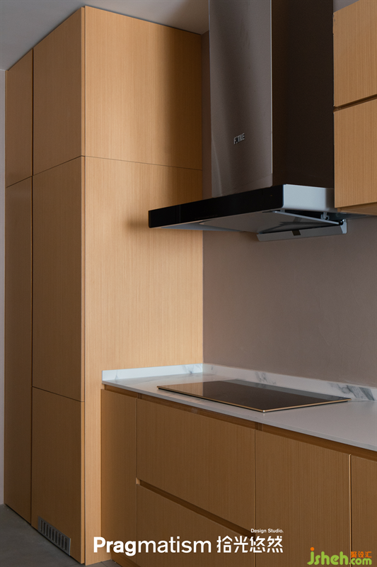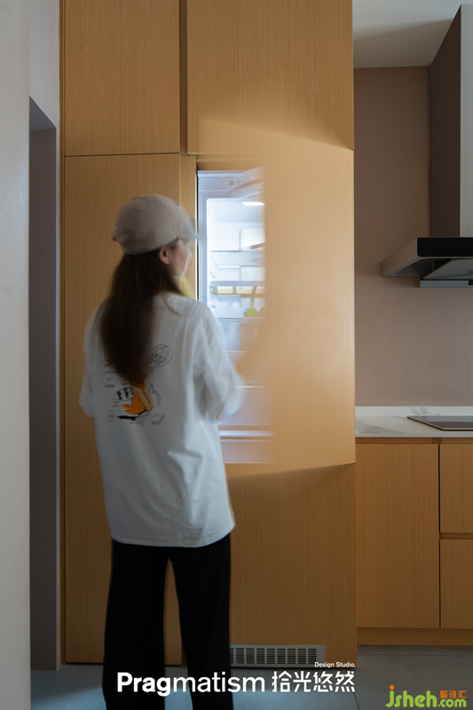 小戶型更需考慮整潔度和空間的利用率,因此在設(shè)計(jì)上,大部分家電采用嵌入式處理。冰箱隱藏在入戶左側(cè)柜體內(nèi)部,下方預(yù)留出通風(fēng)口,同色的木飾面體現(xiàn)出一體化的美感。