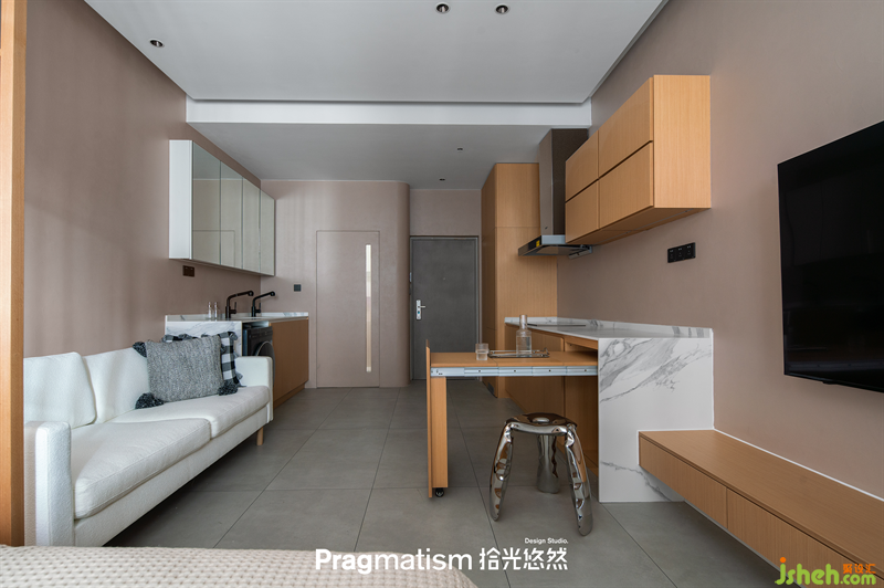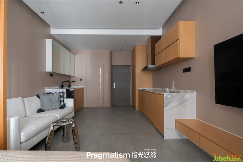 ? 空間:由于是單面采光,所以除衛(wèi)生間外的其他空間,全部做成開放式。屋主并非長(zhǎng)期居住無(wú)需太多收納空間,所以在滿足基本收納需求的基礎(chǔ)上,部分家電做嵌入式處理,整體更加的簡(jiǎn)約統(tǒng)一。