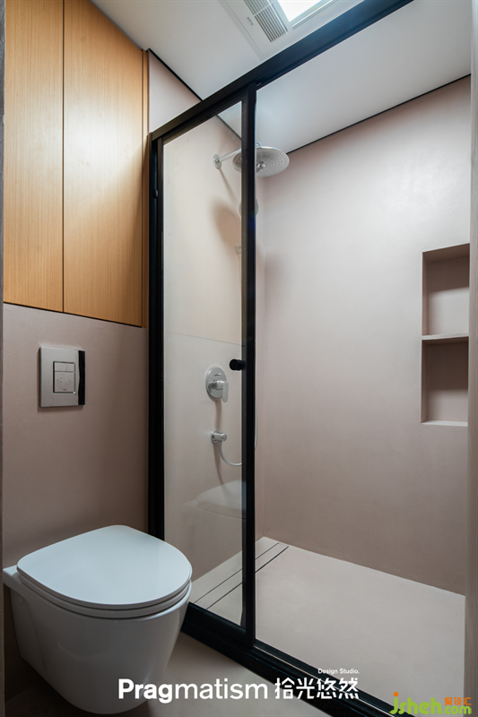 拾光悠然設(shè)計(jì)沿著進(jìn)門右手邊的弧形墻體,推開與墻面同色的隱框門,即進(jìn)入衛(wèi)浴區(qū)。衛(wèi)浴區(qū)吊頂脫縫產(chǎn)生懸浮感,墻面和地面全部使用微水泥,質(zhì)感自然細(xì)膩,通體無(wú)縫更美觀。