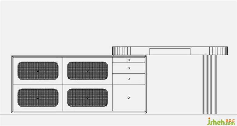 整個(gè)斗柜除開(kāi)加大了抽面的四個(gè)大抽屜,抽面有藤編裝飾,抽盒用松木制作(水性清漆涂裝)以外,其他部分都以黑色半開(kāi)放漆涂裝。