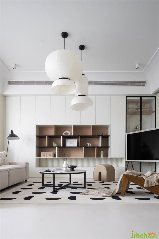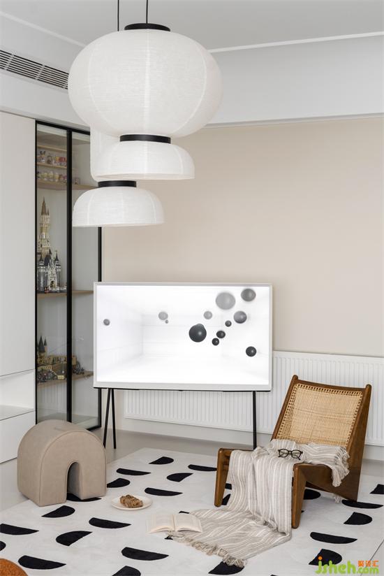 屋主喜歡在客廳看電視、玩游戲,所以選擇顏值超高的三星畫境電視+投影相結合的方式,電視背后就是投影幕布的位置。