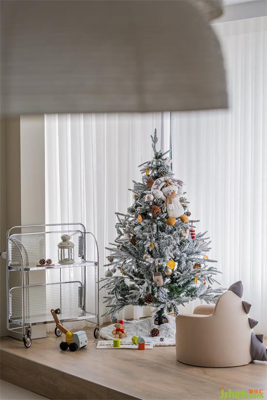 圣誕期間,屋主為新家搬來了一棵圣誕樹。這兒原本是空調(diào)機位,因為臥室改成書房后不再需要空調(diào),家裝設計便將這一部分包進來,改為地臺,把原本的下水管進行包裹處理。