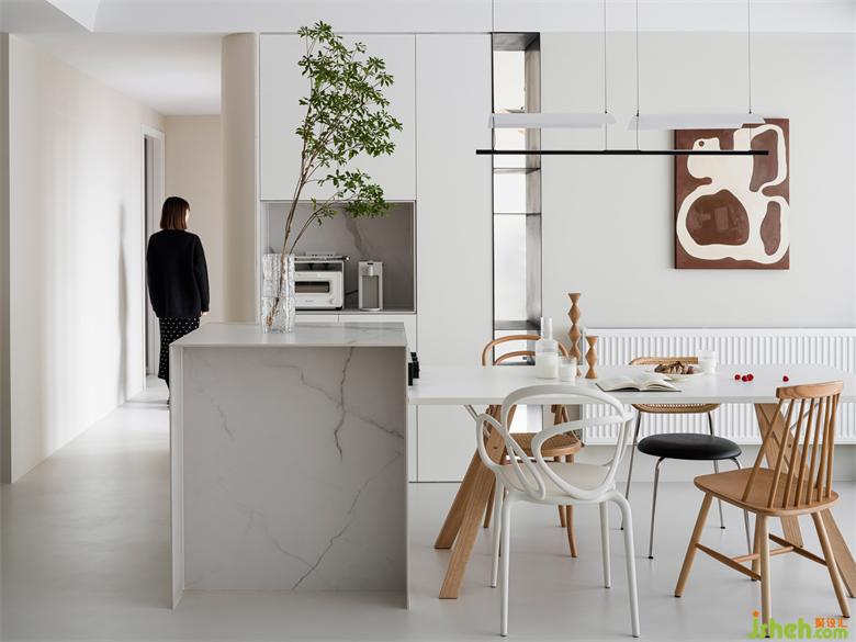 餐廳區(qū)域為島臺+餐桌的形式。我們將餐桌后面的非承重墻拆除,多出的空間設計為背對的餐邊柜+雜志架,并在邊緣做弧形處理,與頂部相呼應。