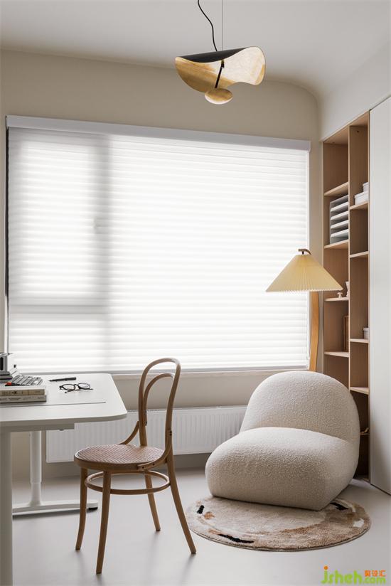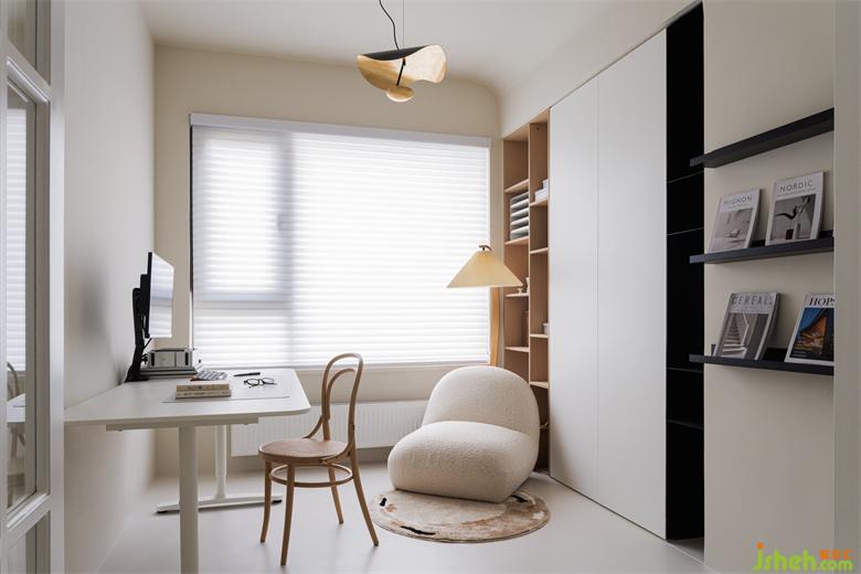 選擇成品書桌,后期若有其他的臨時(shí)需求(住宿、兒童游玩等),也可靈活應(yīng)對。家裝設(shè)計(jì)折疊門+開放格,擴(kuò)大了書房在視覺上的尺寸。