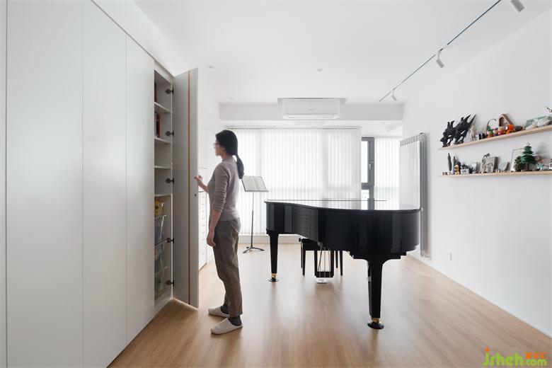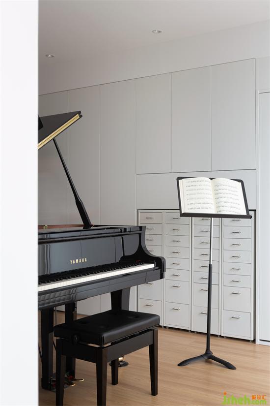 琴譜就近放在一旁的的收納柜里,舊房改造屋主將其分門別類、集中收納。