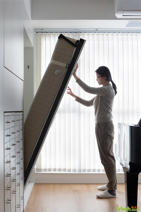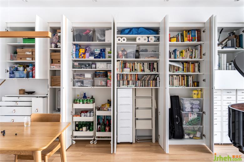 從入戶開始,首飾區(qū)、鞋區(qū)、行李箱區(qū)、酒品飲料區(qū)、零食區(qū)、清潔物品區(qū)、工具雜物區(qū)、書籍區(qū)、小型打印機區(qū)、琴譜區(qū)、樂器區(qū),舊房改造以及最內(nèi)側(cè)的墨菲床,每一區(qū)域都規(guī)劃得井井有條。
